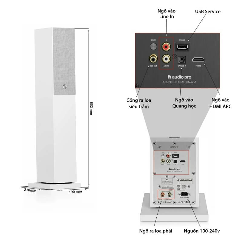 Loa AudioPro A38 trang bị mạch khuếch đại Class D công suất mỗi kênh 75W trong hệ thống âm thanh 2 chiều bao gồm một loa tweeter vòm 2,54 cm (1″) và hai loa trầm 11,4 cm (4,5″).